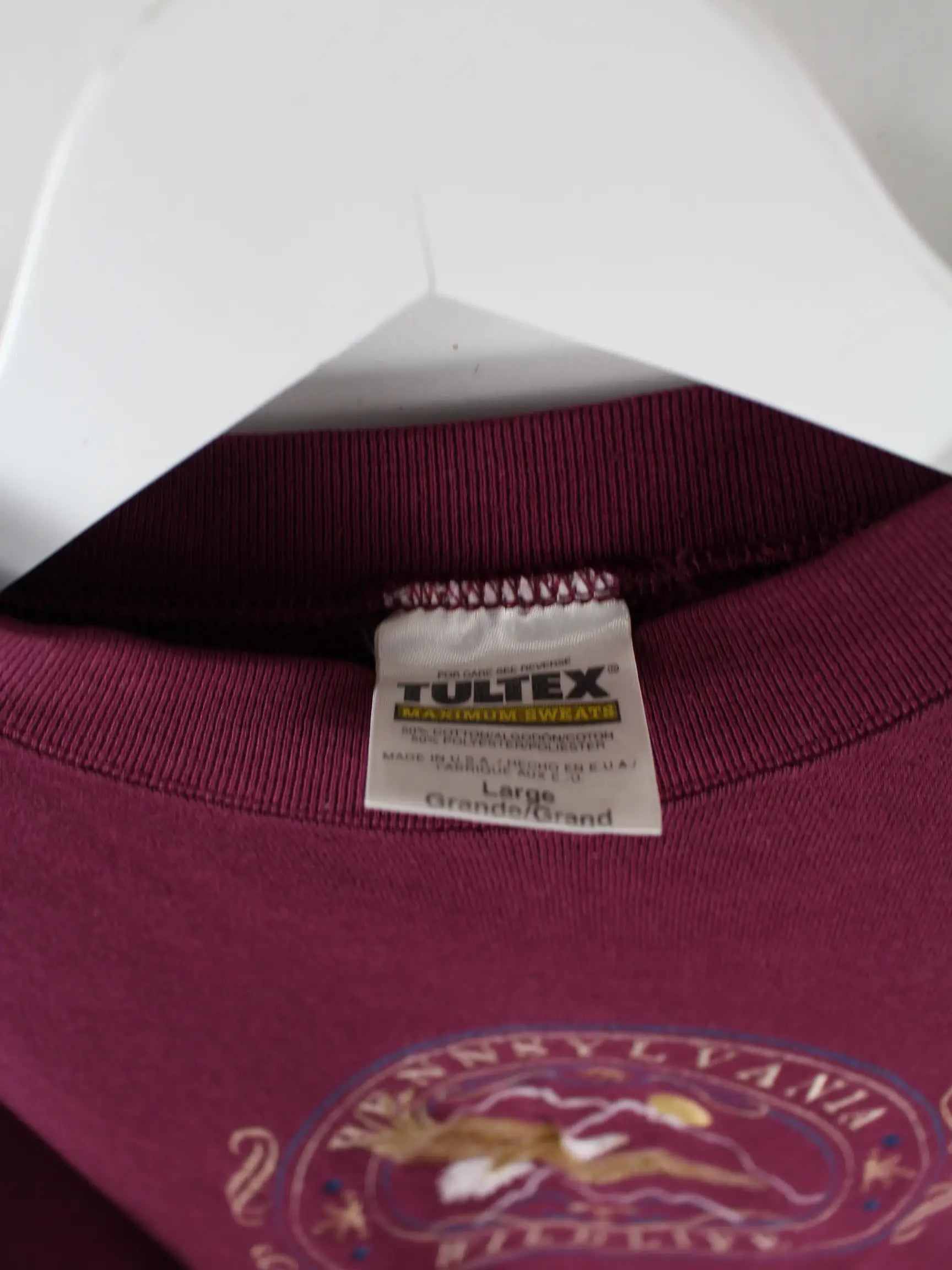 Roter Sweater mit Stickereien der Brand Tultex aus den 90'ern in Größe L. Er ist aus einer Baumwollmischung angefertigt. Den Zustand würden wir als 'In Ordnung' bezeichnen (vergl. Bilder).