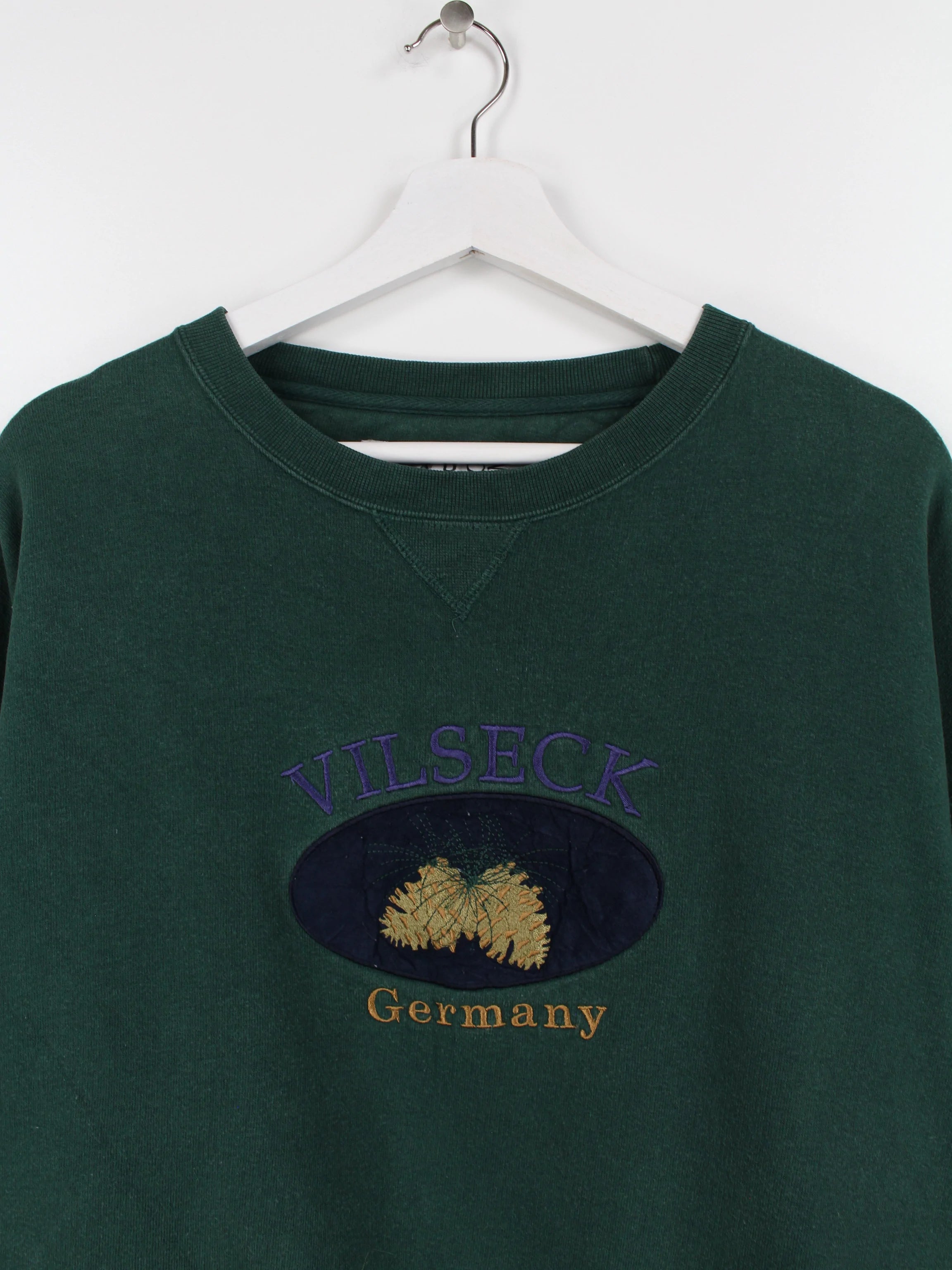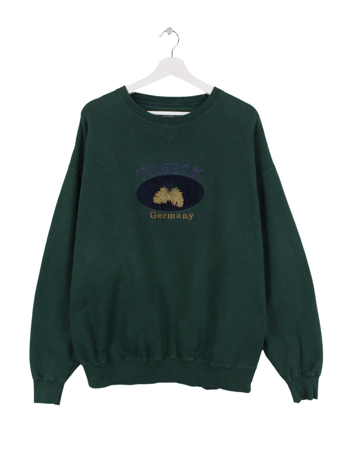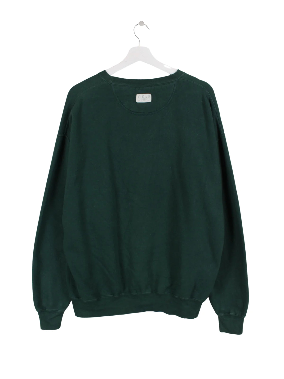 Grüner Sweater mit gesticktem Logo auf der Brust.