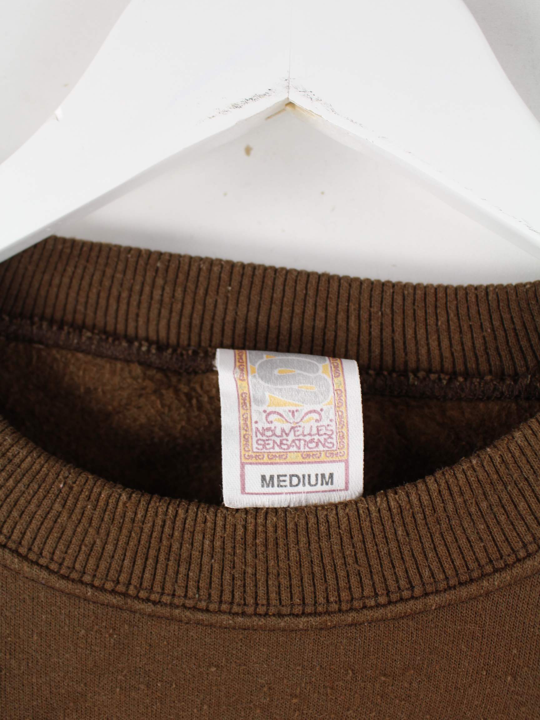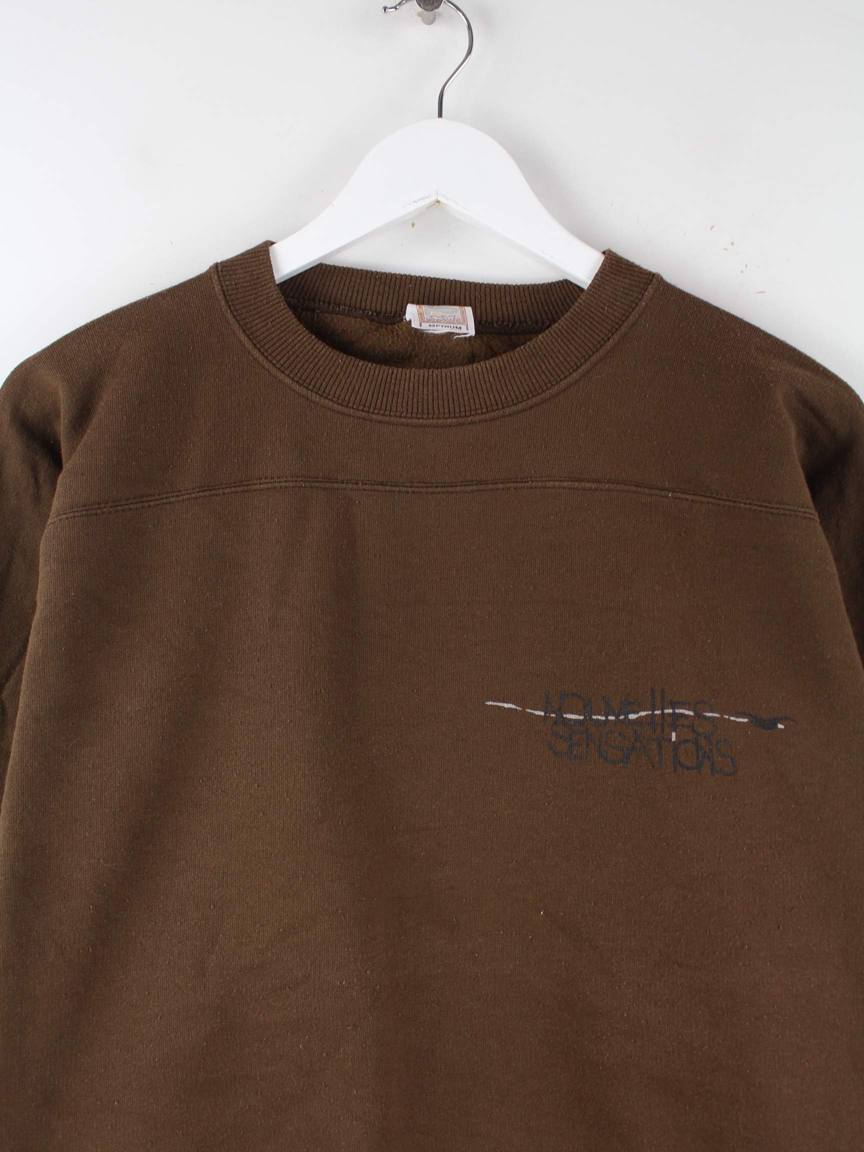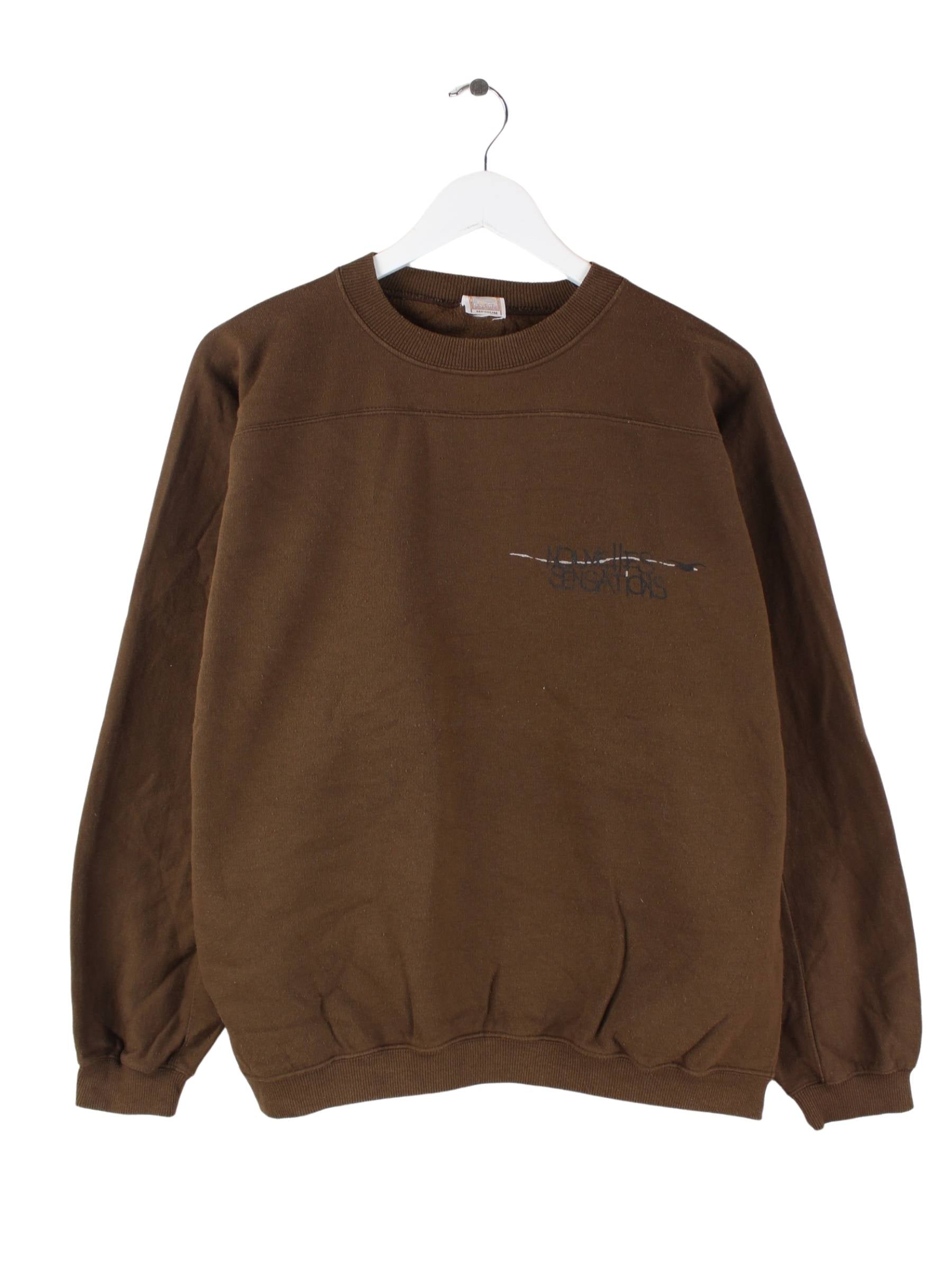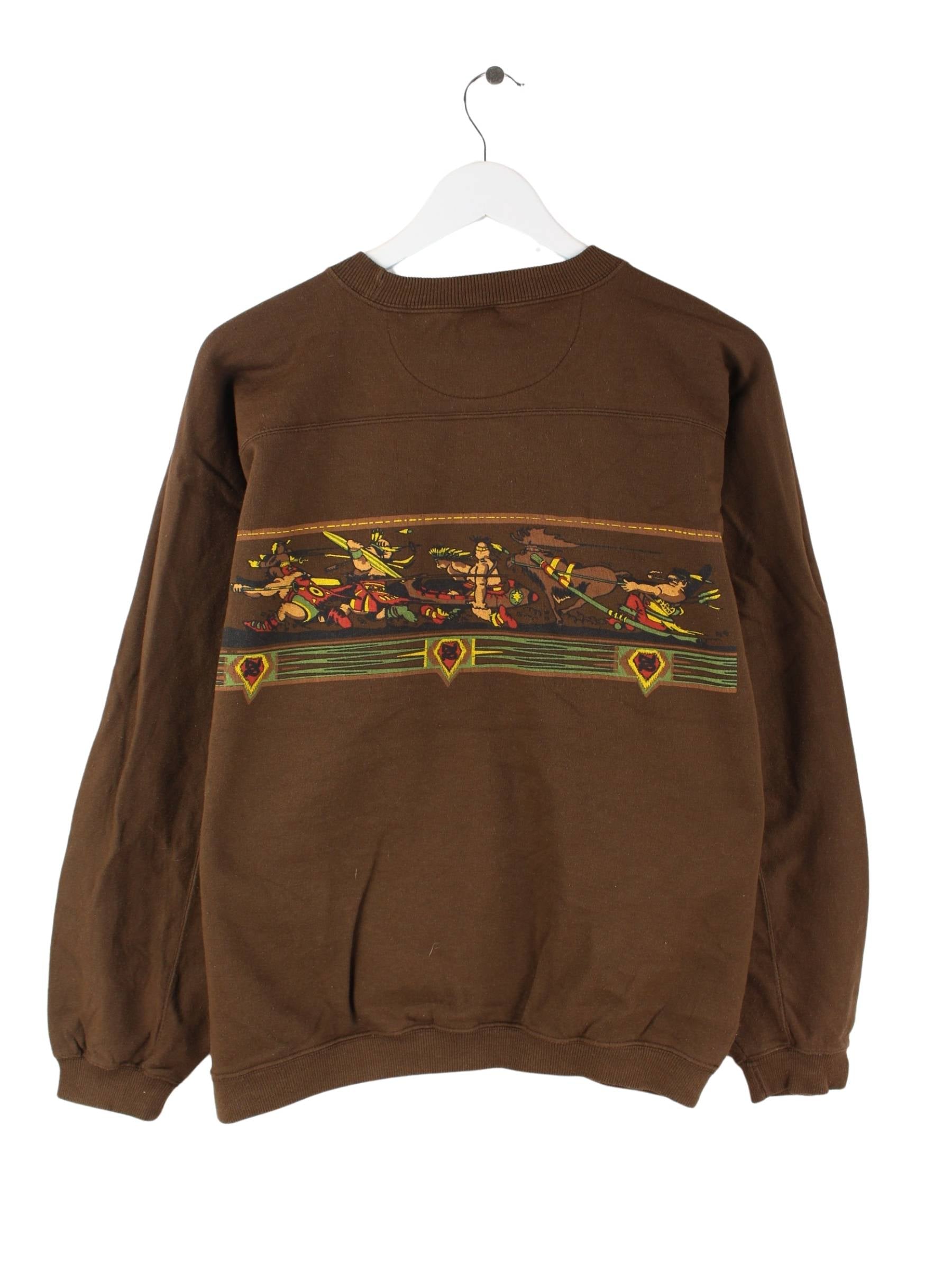 Brauner Vintage Sweater in Größe M. Er ist aus einer Baumwollmischung produziert und in sehr gutem Zustand bei uns vorrätig. Mit tollem Indiana Print.