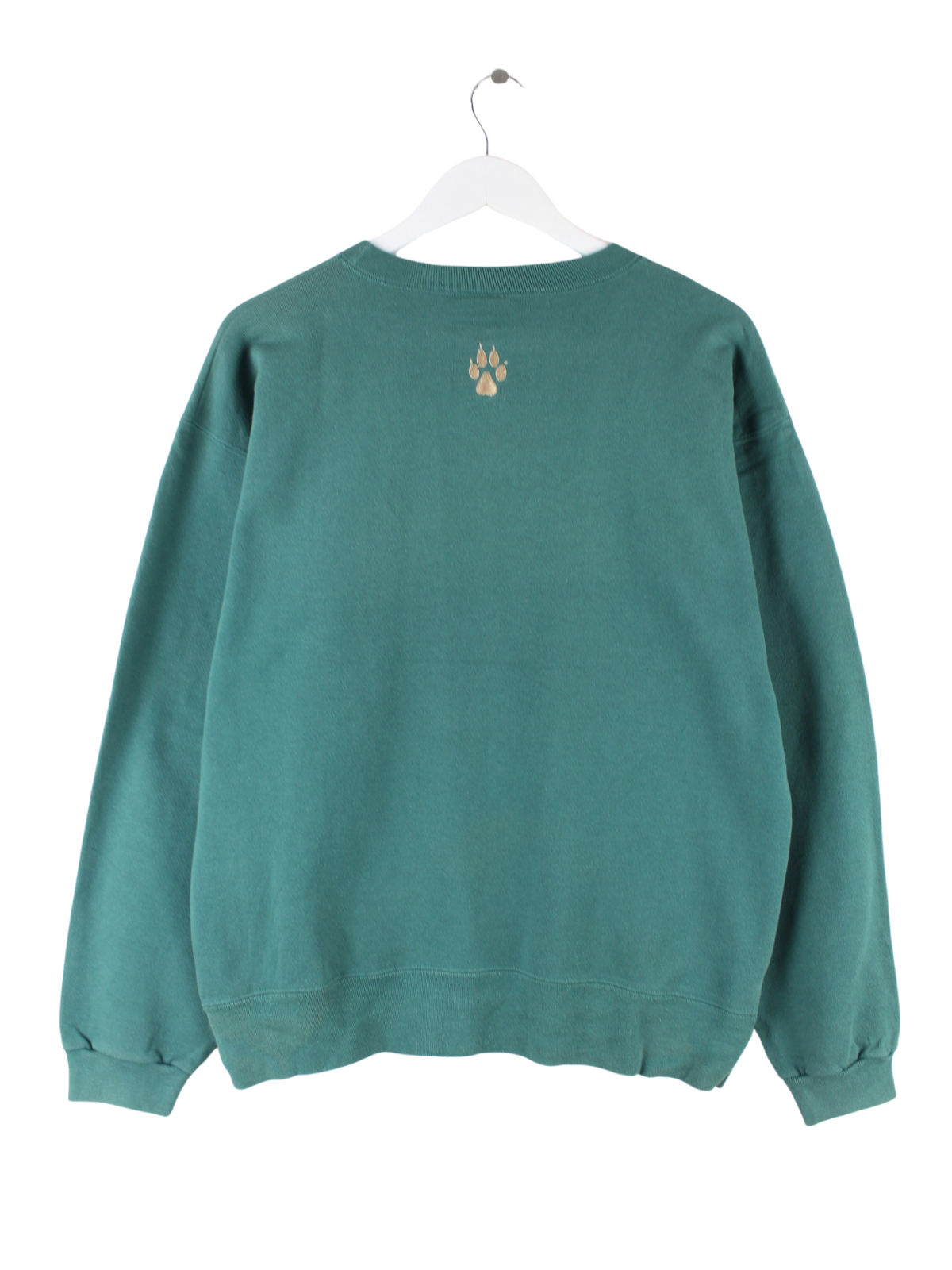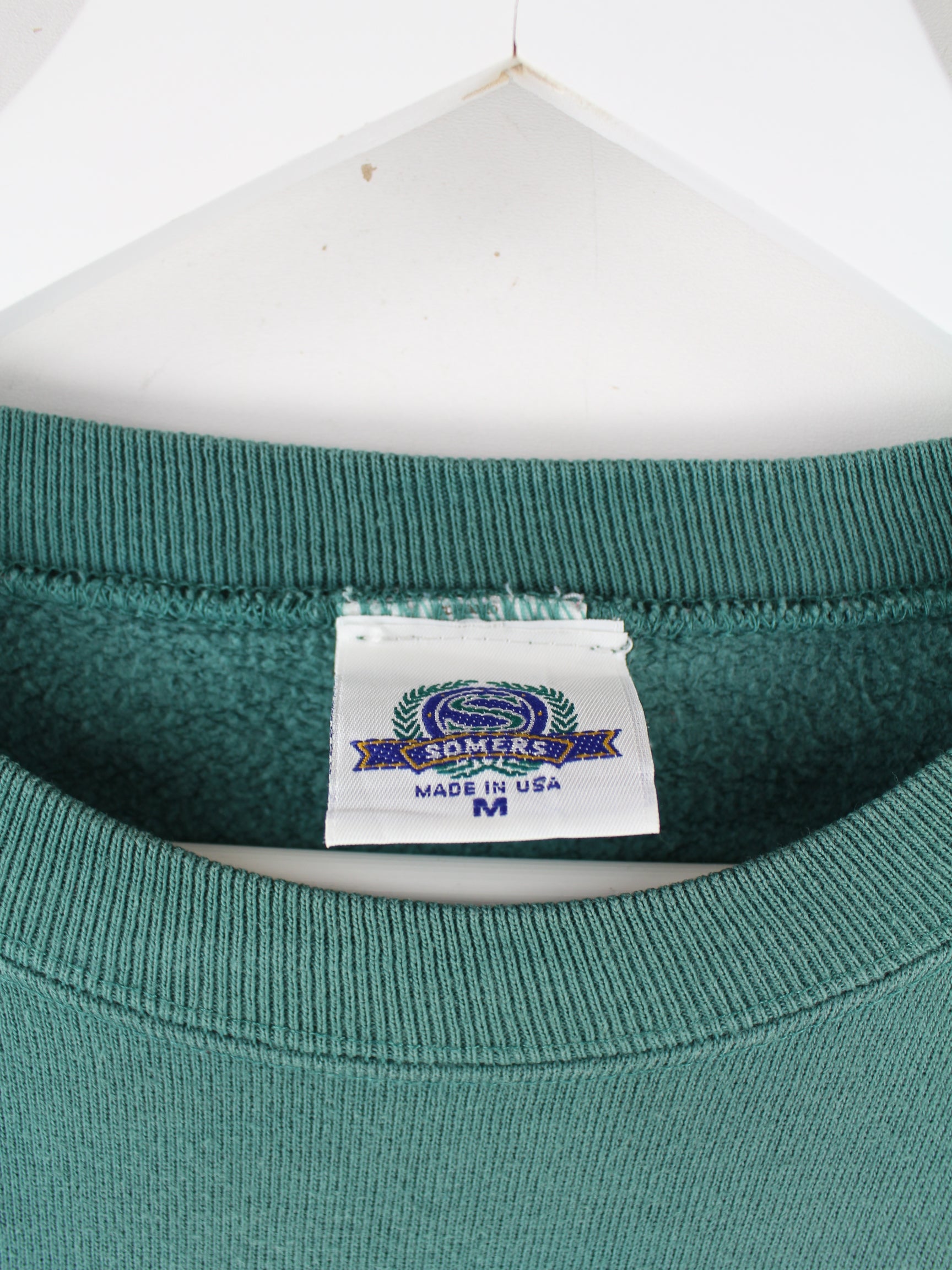 Grüner Vintage Made in USA Sweater mit gesticktem Logo aus den 90'ern in Größe M. Er ist aus einer Baumwollmischung und in sehr gutem Zustand bei uns vorrätig.
