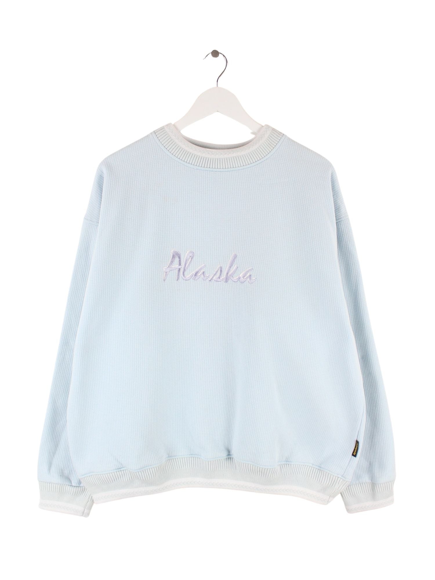 Vintage Sweater in Größe L aus den 90'ern. Er ist aus einer Baumwollmischung und in Blau bei uns zu bekommen.