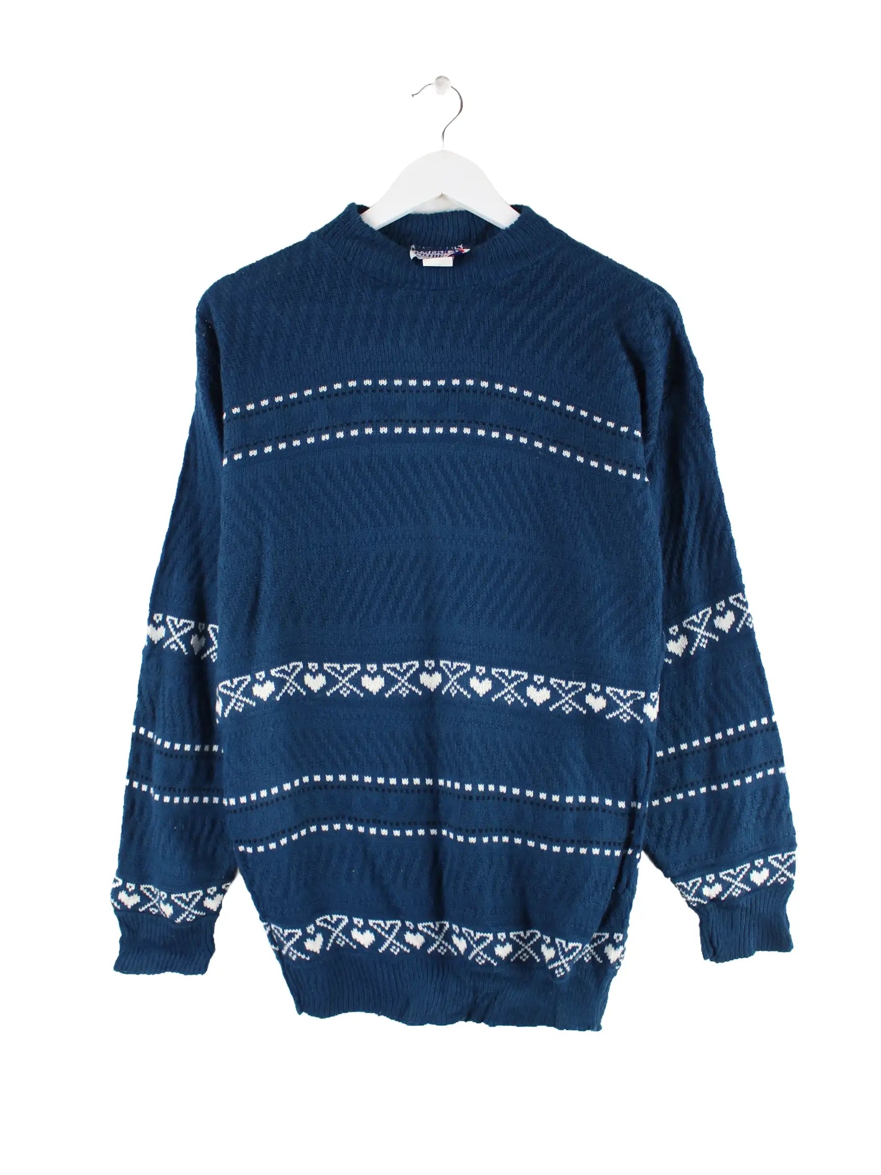 Vintage Pullover in Größe M aus den 90'ern. Er ist aus Acryl hergestellt und in Blau vorrätig.