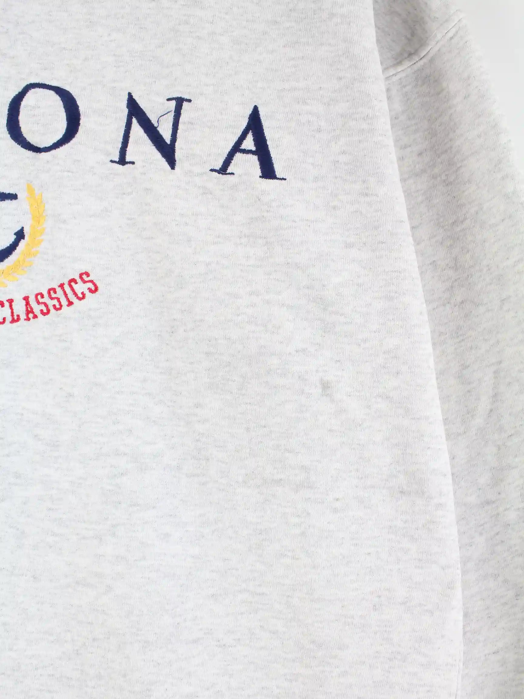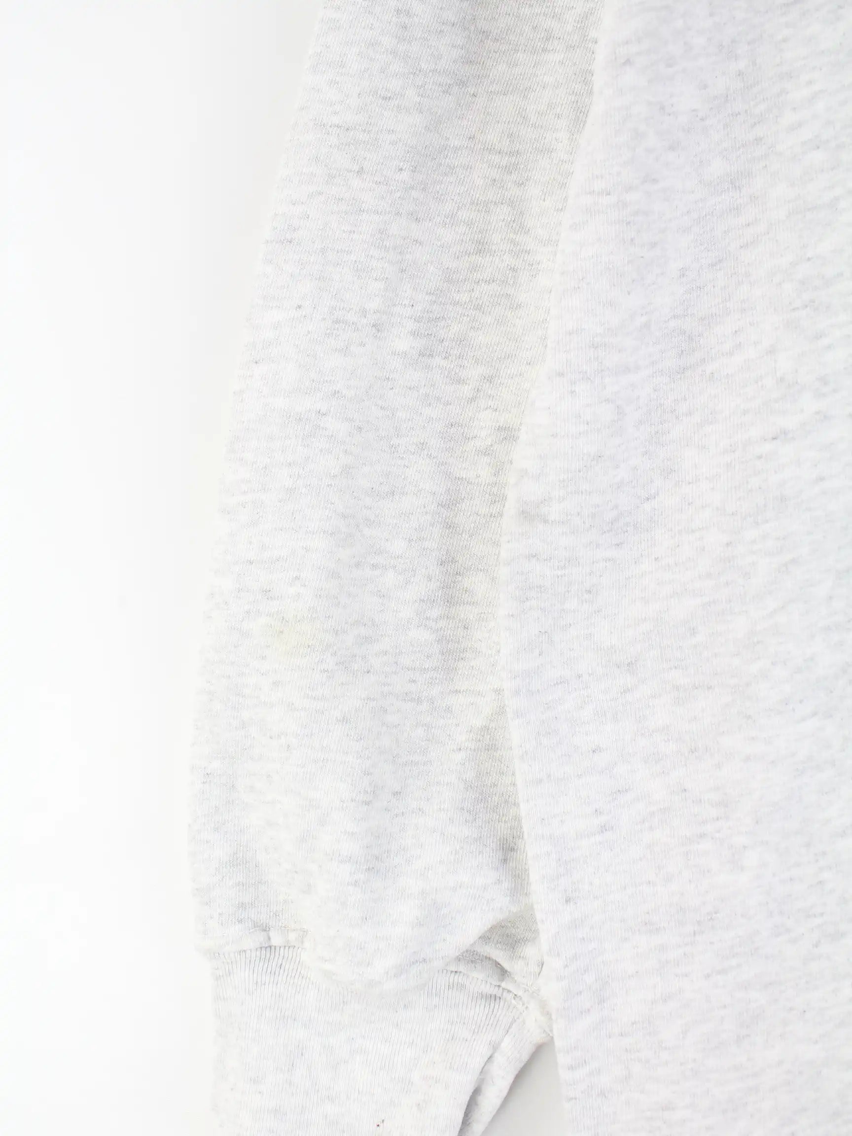Vintage Sweater in Größe M aus den 90'ern. Er ist aus einer Baumwollmischung angefertigt und in Grau bei uns vorrätig.