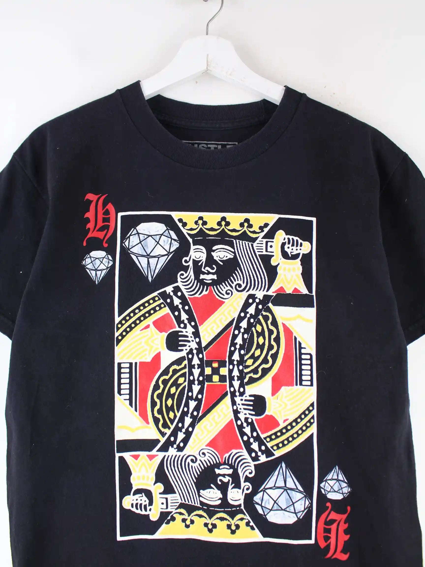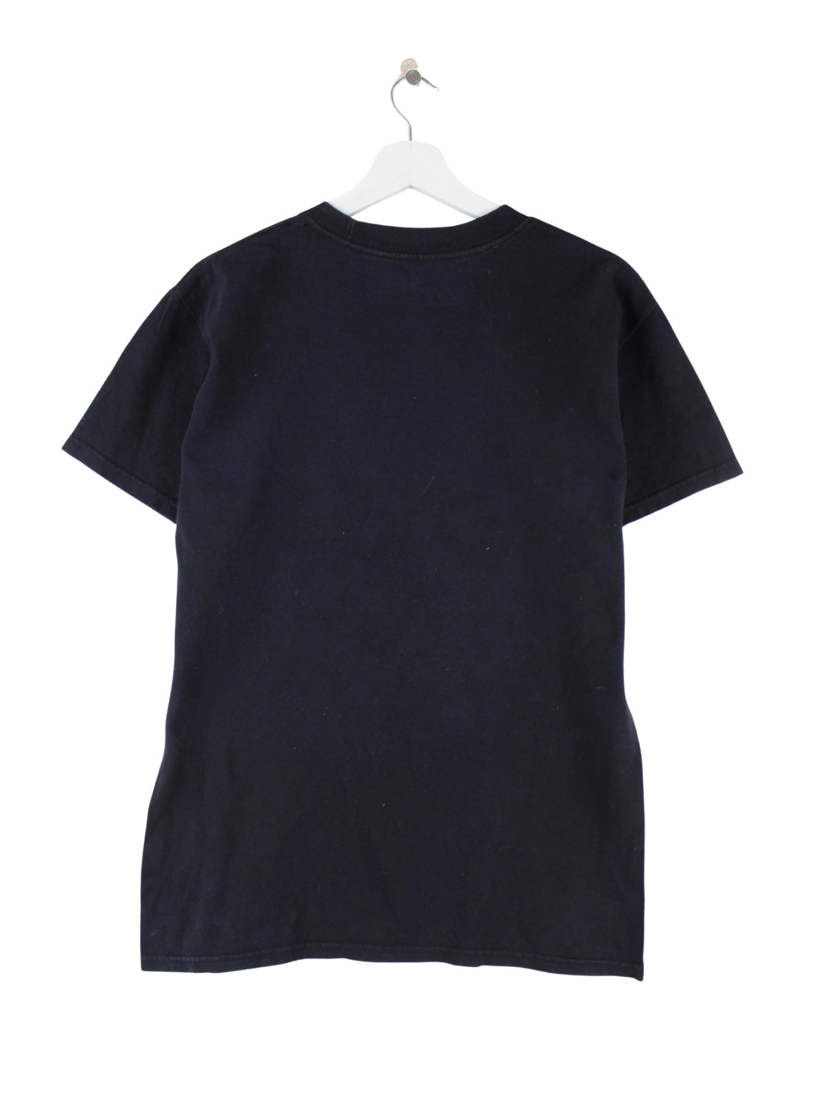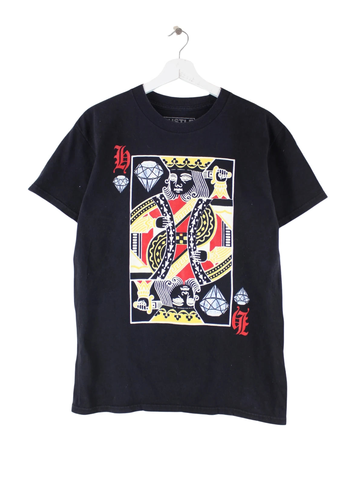 Schwarzes Vintage T-Shirt in Größe M. Es ist aus Baumwolle produziert und in sehr gutem Zustand bei uns vorrätig. Mit tollem Hustle Print.