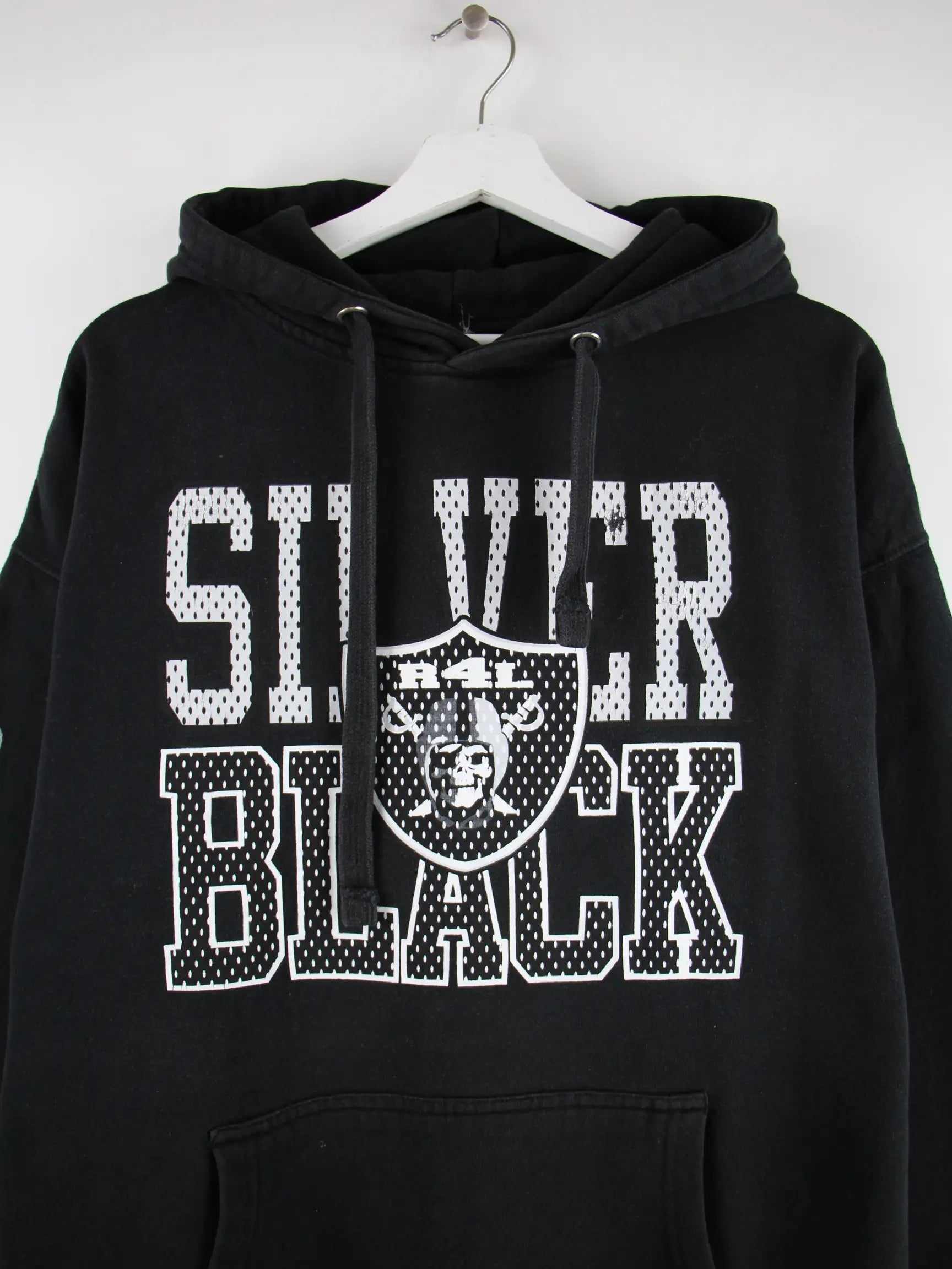 Vintage Hoodie in Größe XL. Er ist aus einer Baumwollmischung gemacht und in Schwarz in Stock. Mit seltenem Raiders Print.