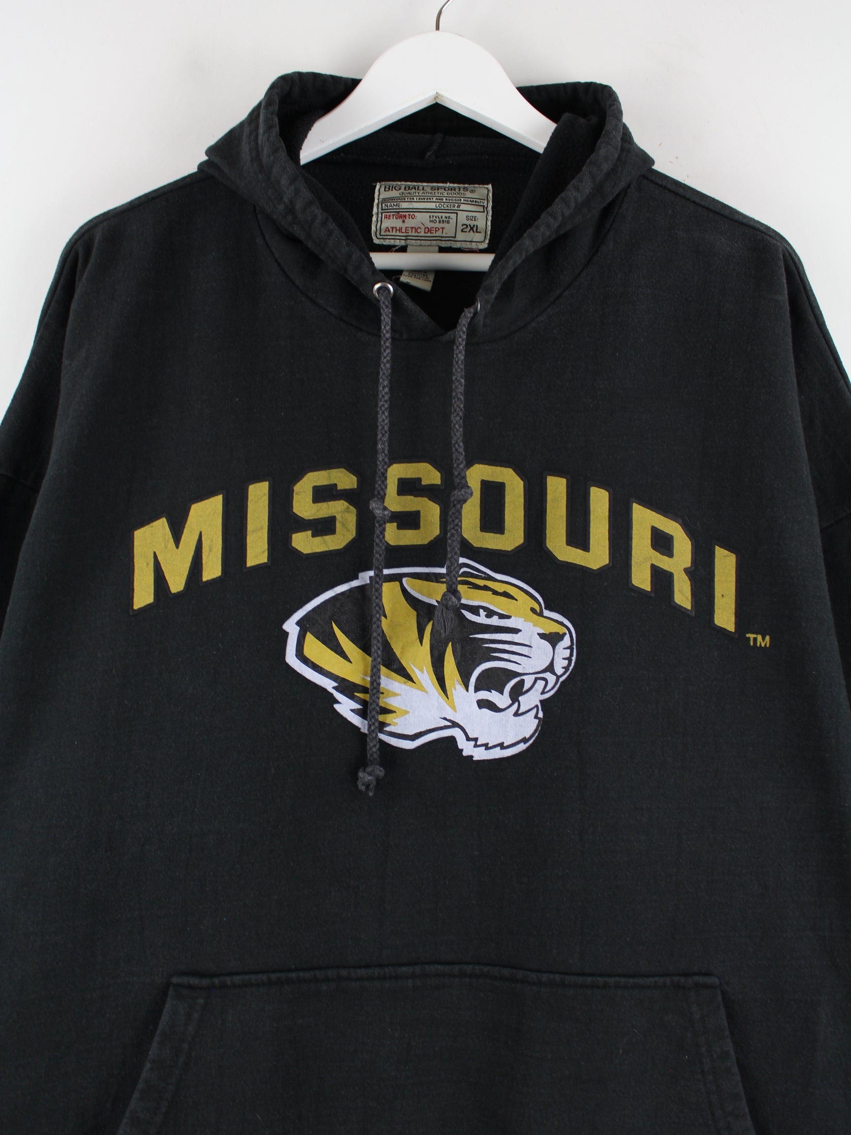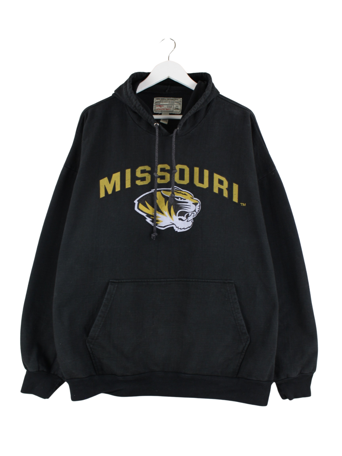 Schwarzer Vintage Hoodie in Größe XXL. Er ist aus einer Baumwollmischung hergestellt und in gutem Zustand bei uns zu bekommen. Mit schönem Missouri Print.