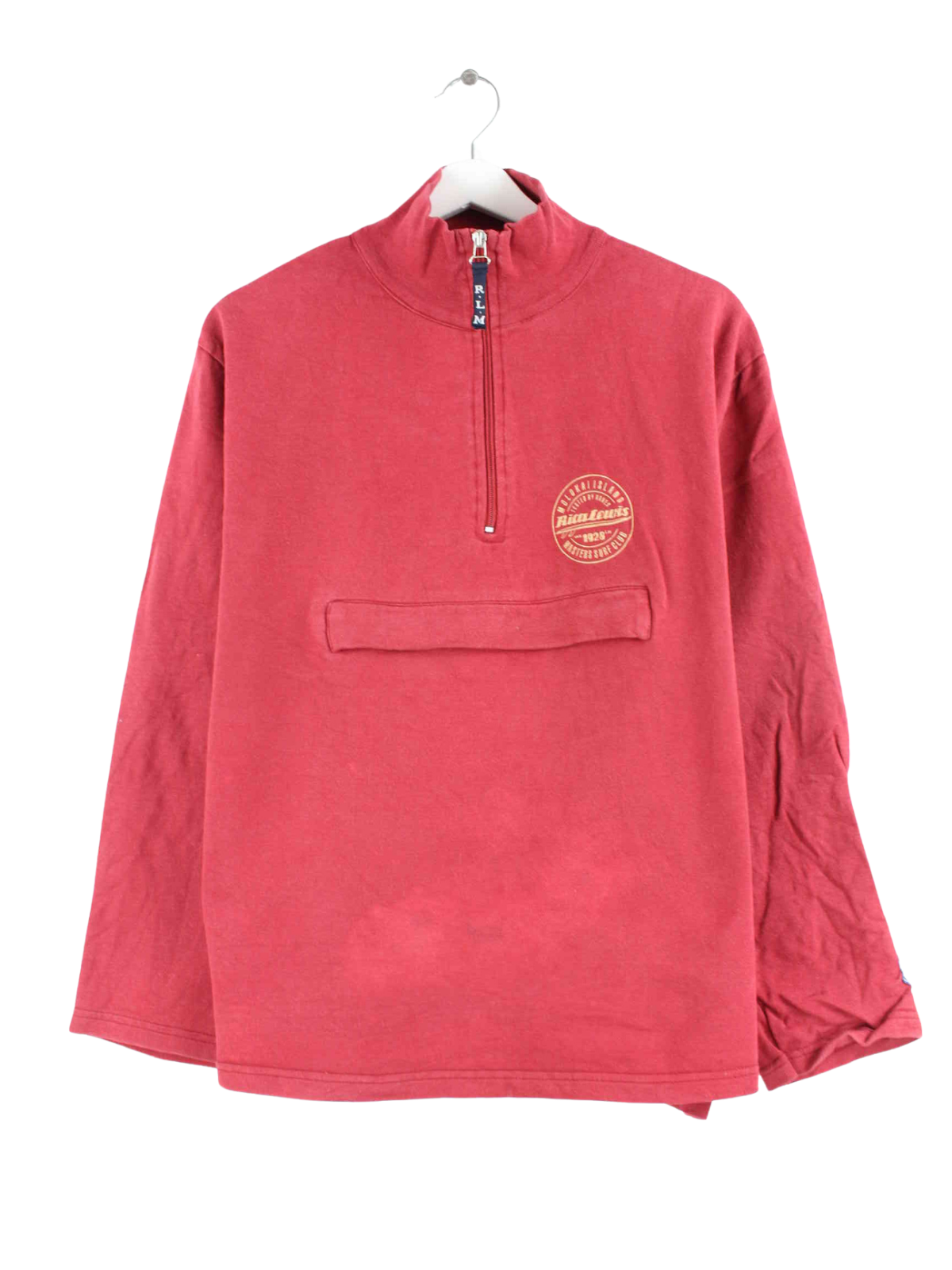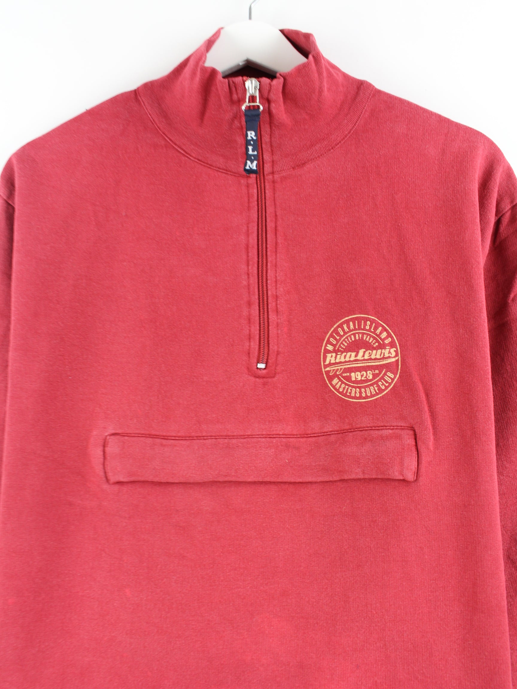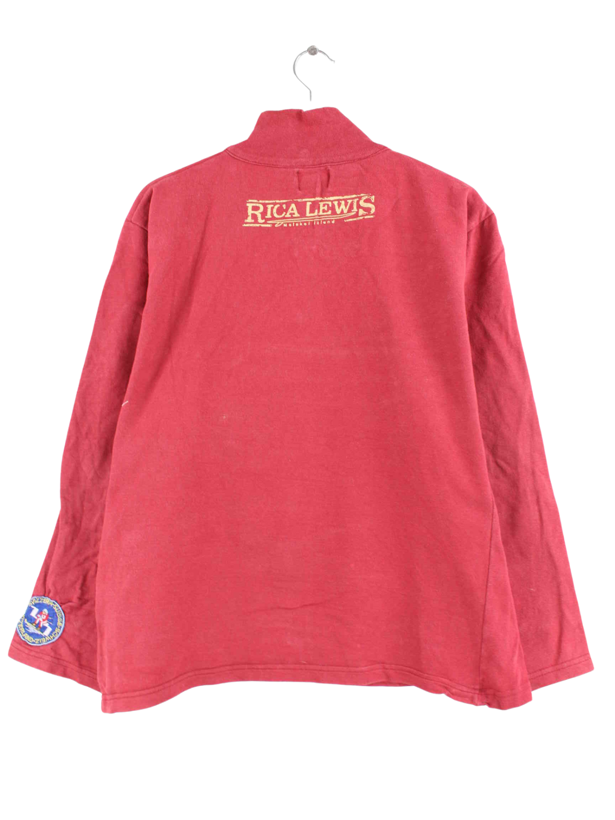 Vintage Sweater mit halbem Reißverschluß in Größe M. Er ist aus einer Baumwollmischung hergestellt und in Rot lieferbar. Mit chiquem undefined Print.