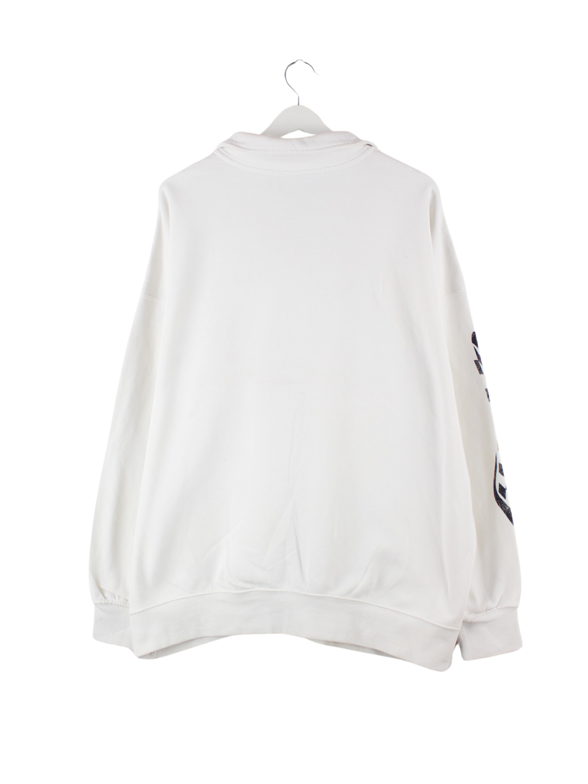 Vintage Sweater mit half Zip in Größe XXL. Er ist aus einer Baumwollmischung produziert und in Weiß auf Lager. Mit schönem Racing Print.
