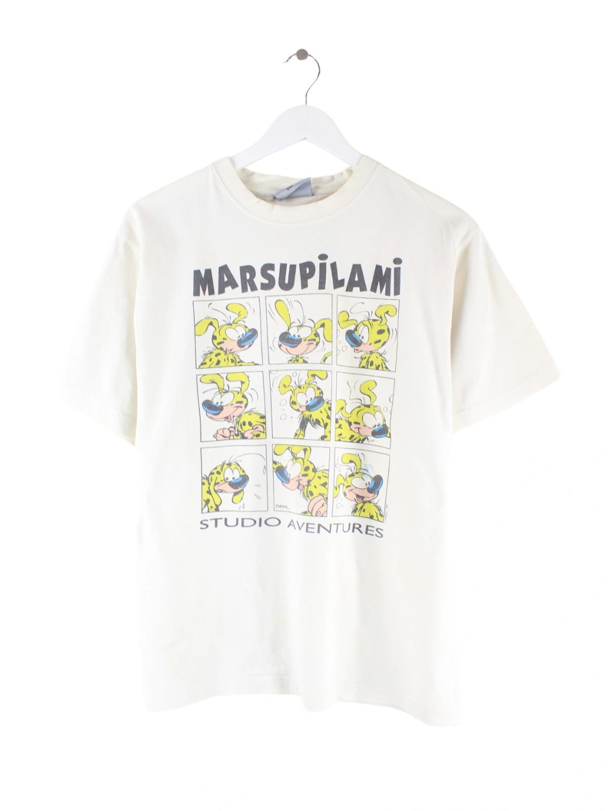 Vintage T-Shirt in Größe S aus den 90'ern. Es ist aus Baumwolle angefertigt und in Weiß bei uns vorrätig. Mit tollem Marsupilami Print.