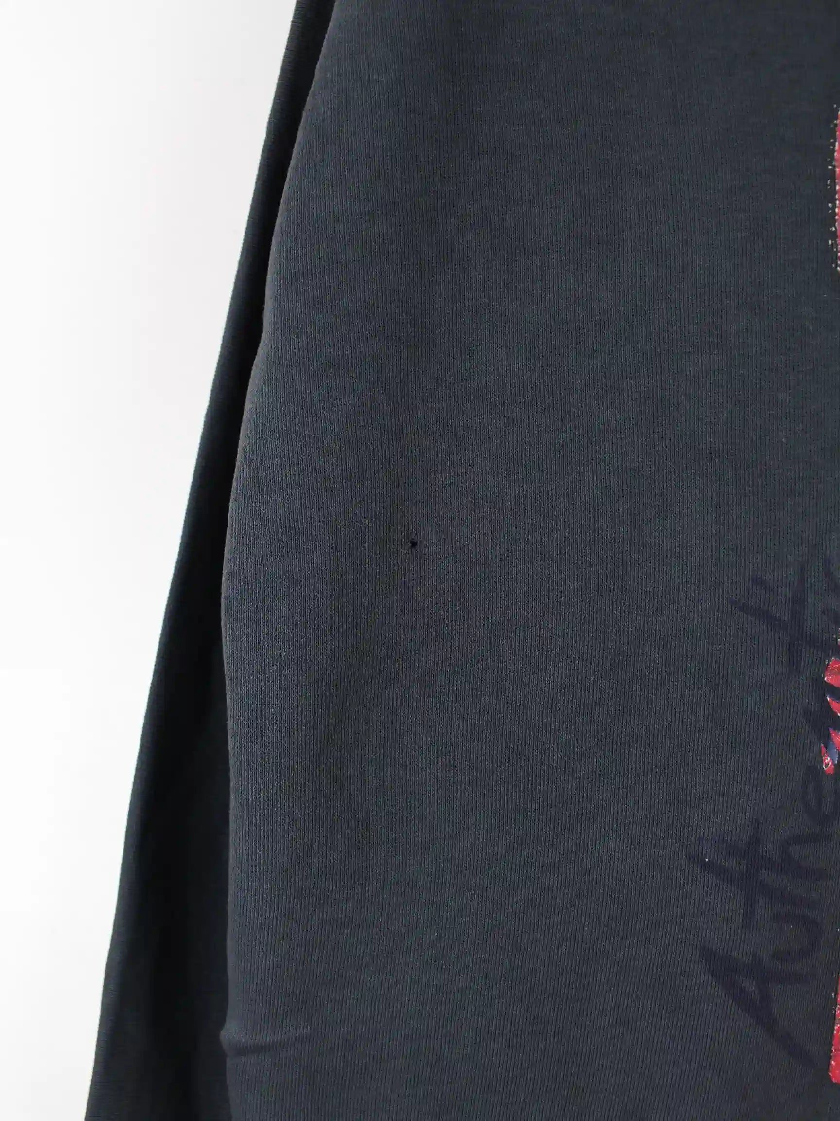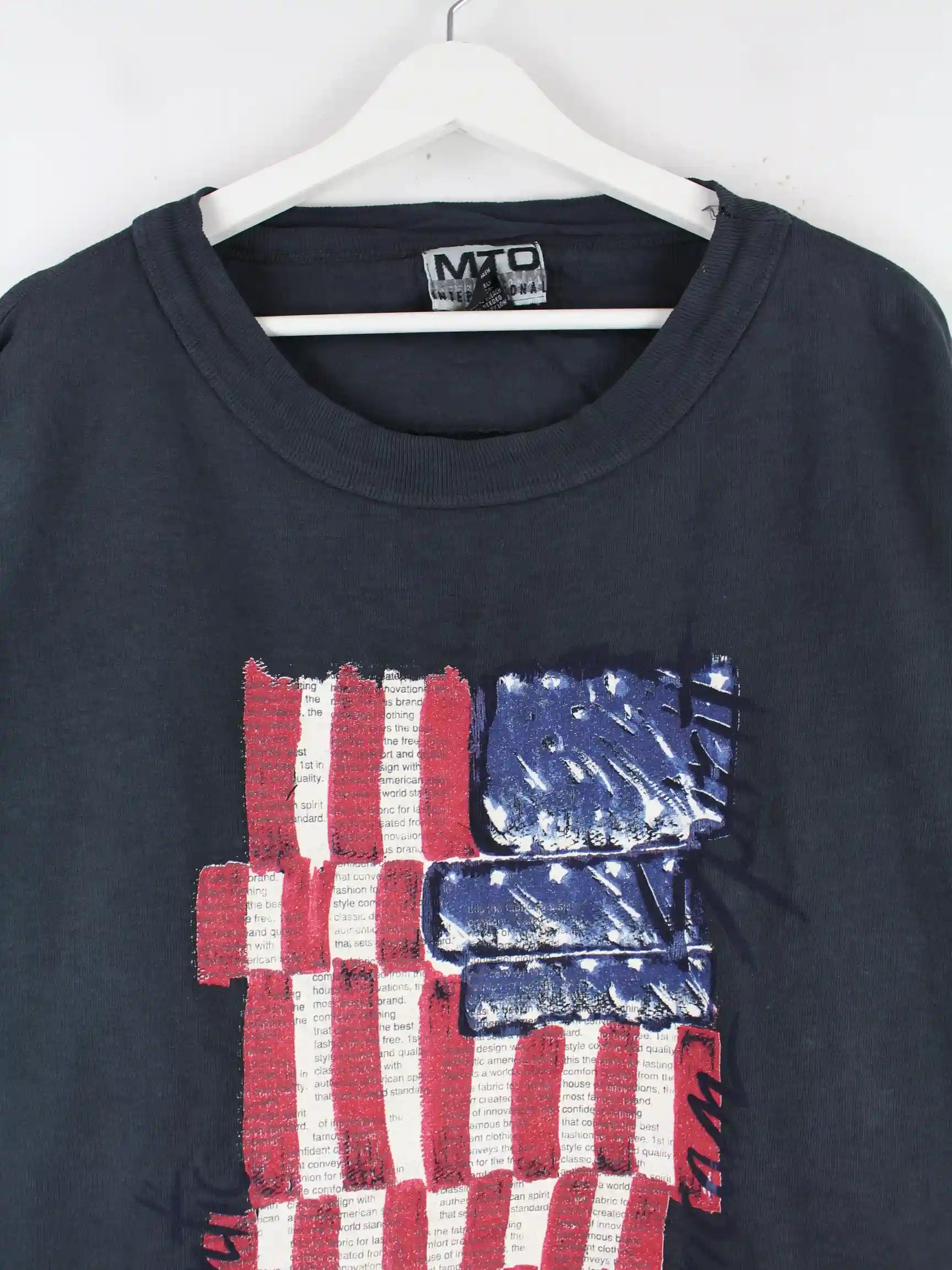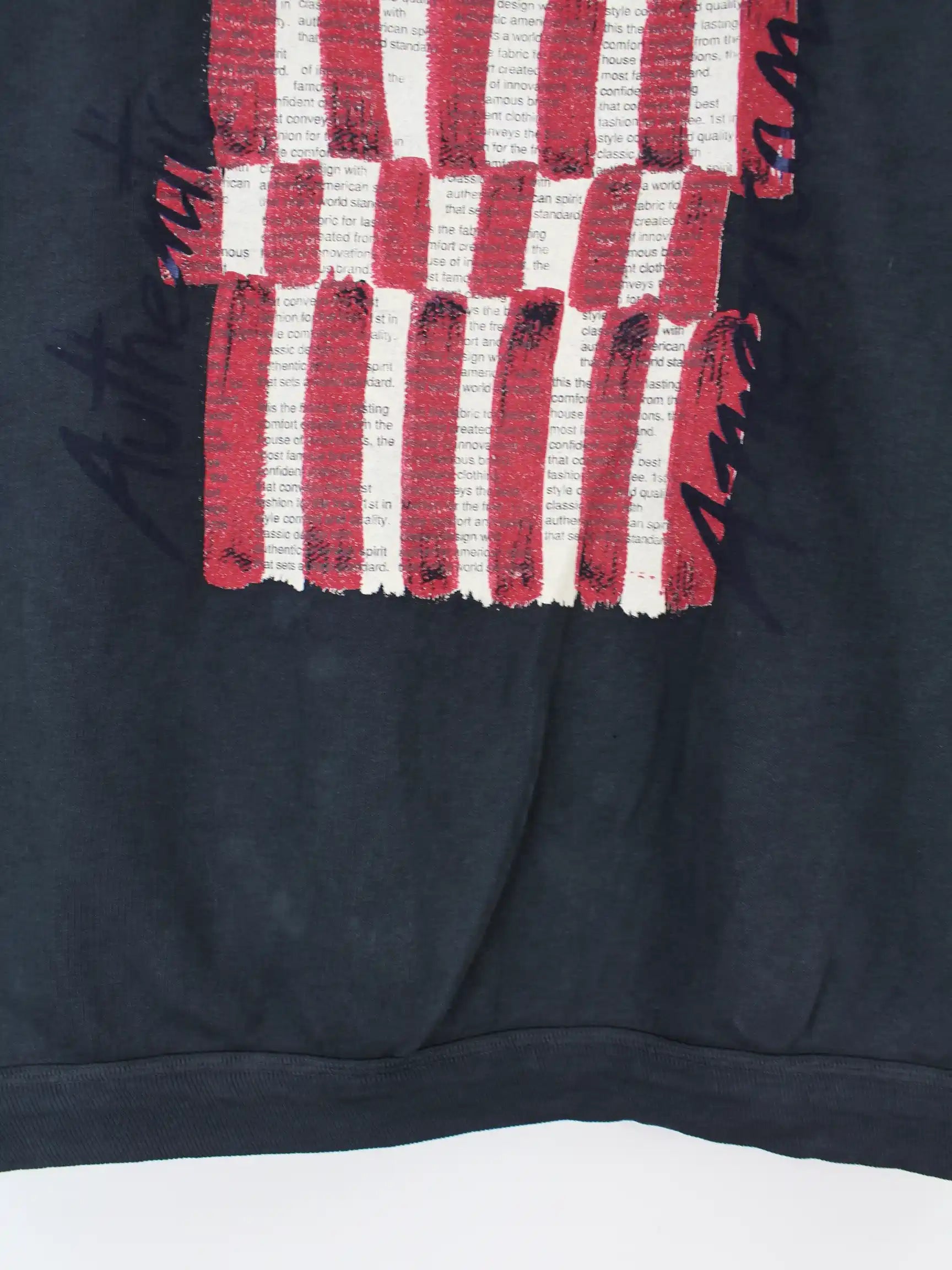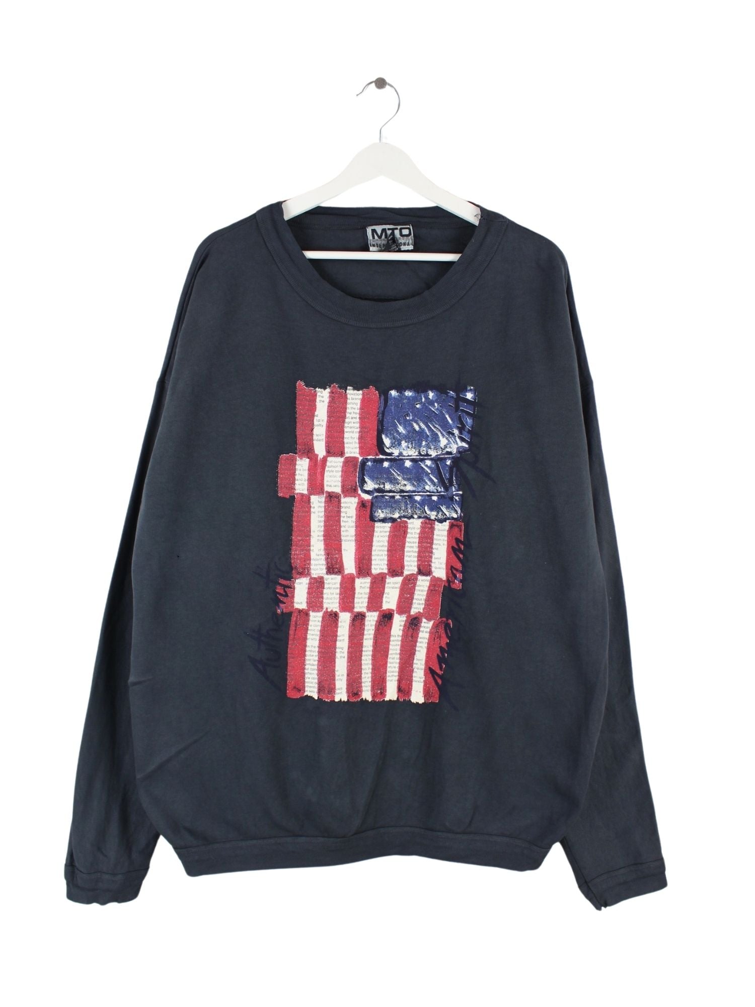 Grauer Vintage Sweater in Größe L. Er ist aus einer Baumwollmischung gefertigt. Den Zustand würden wir als 'In Ordnung' bezeichnen (vergl. Bilder).Mit chiquem USA Print.