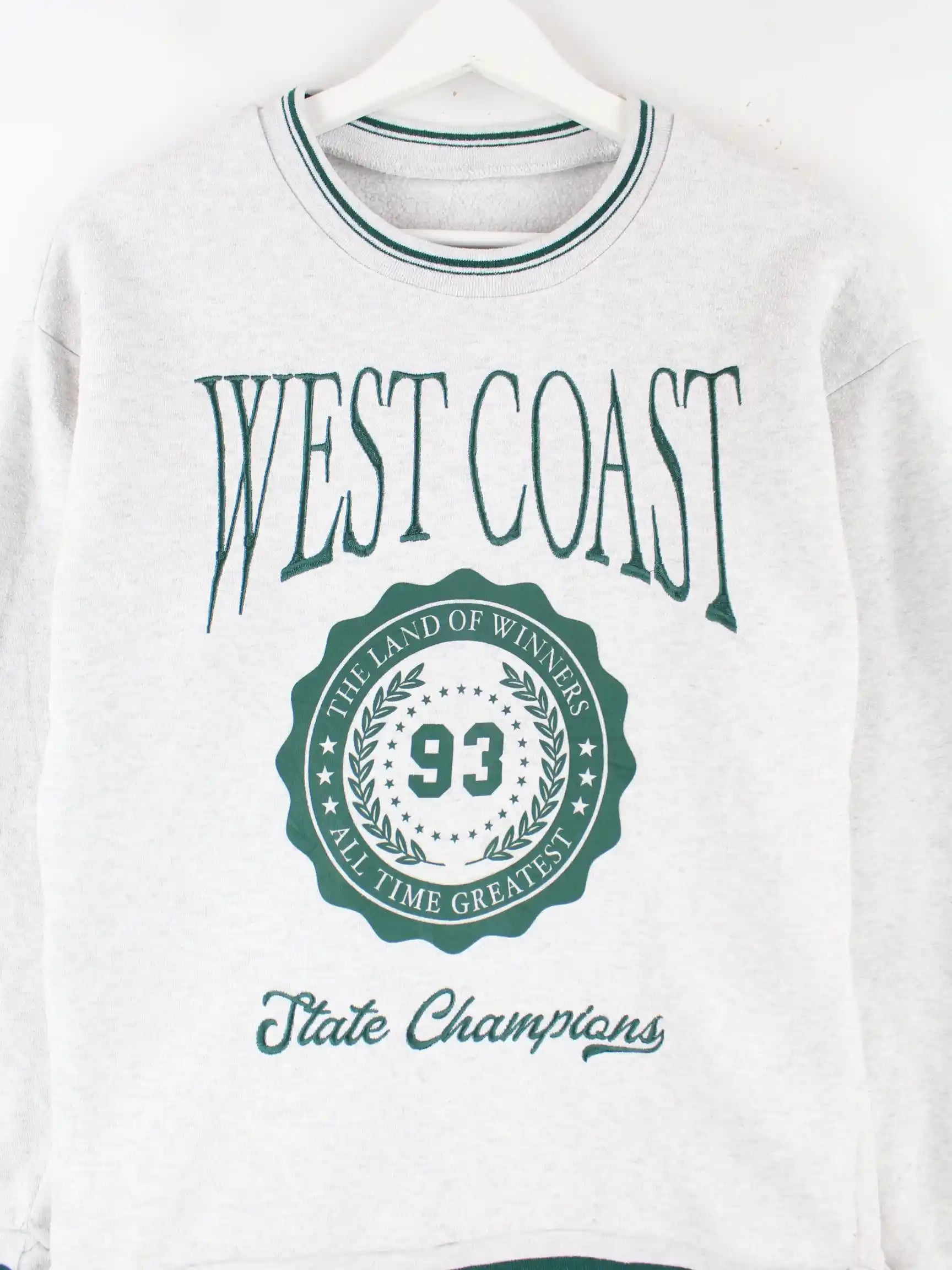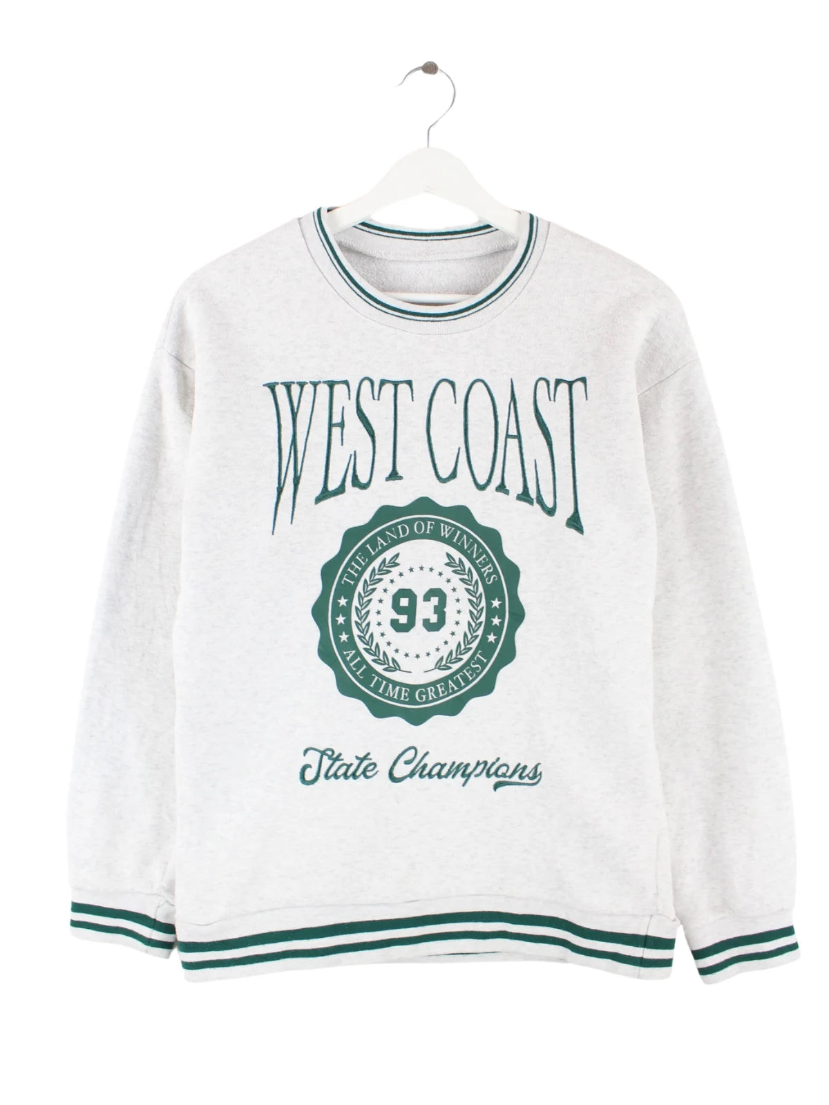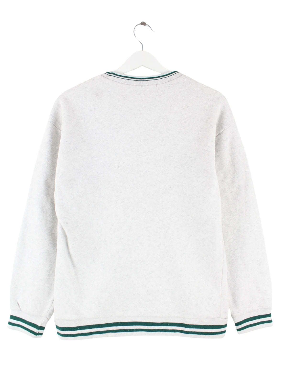 Grauer Vintage Sweater in Größe S. Er ist aus einer Baumwollmischung hergestellt und in sehr gutem Zustand bei uns zu bekommen.