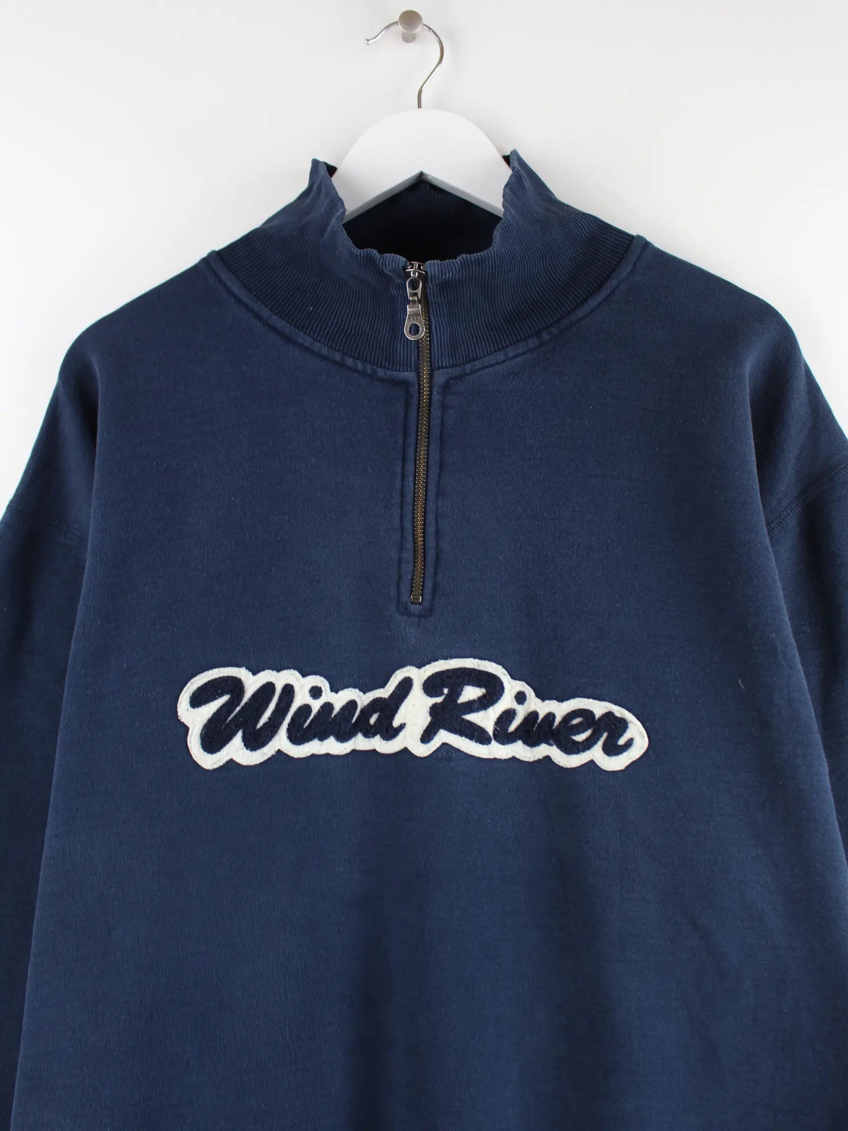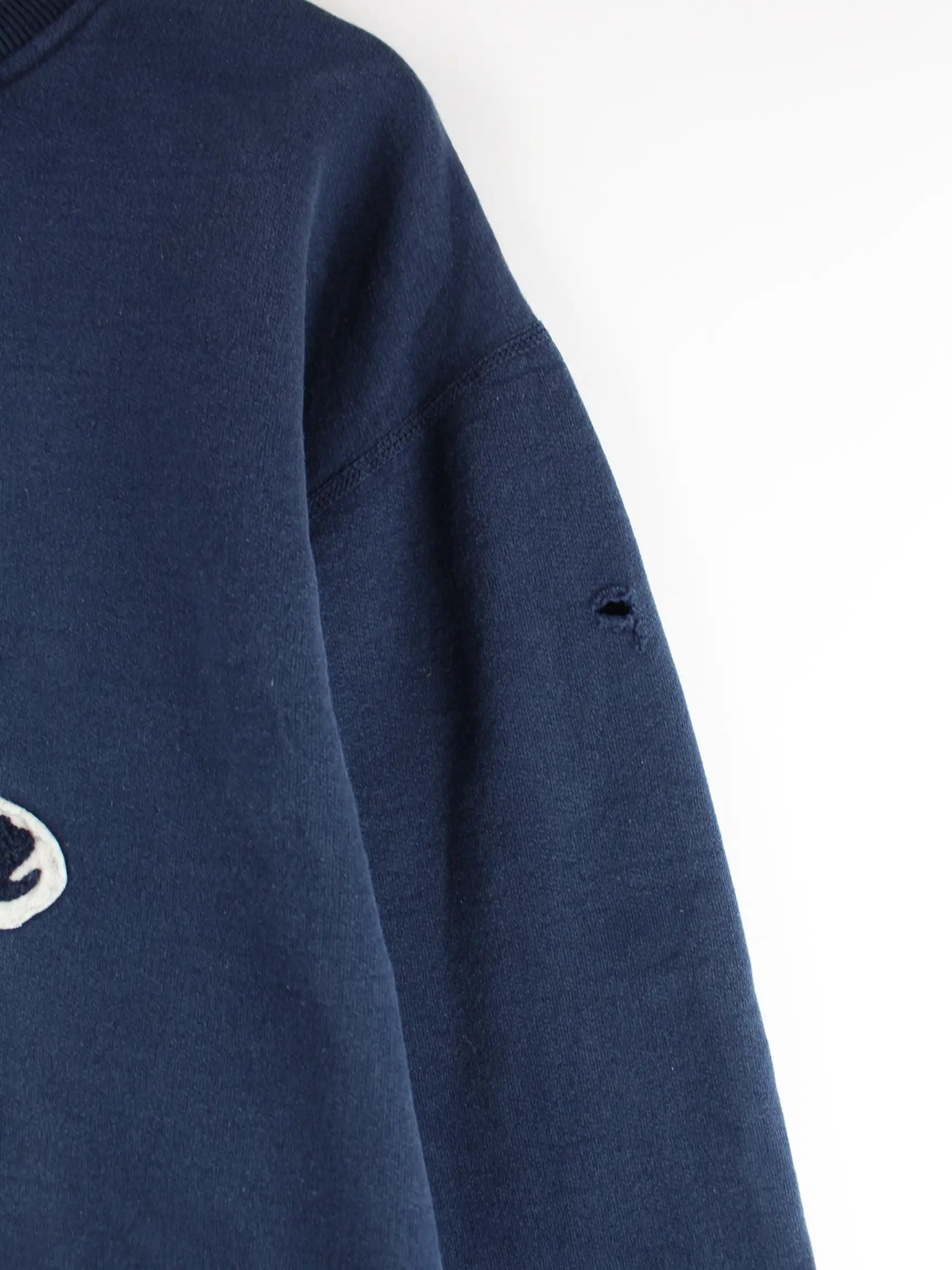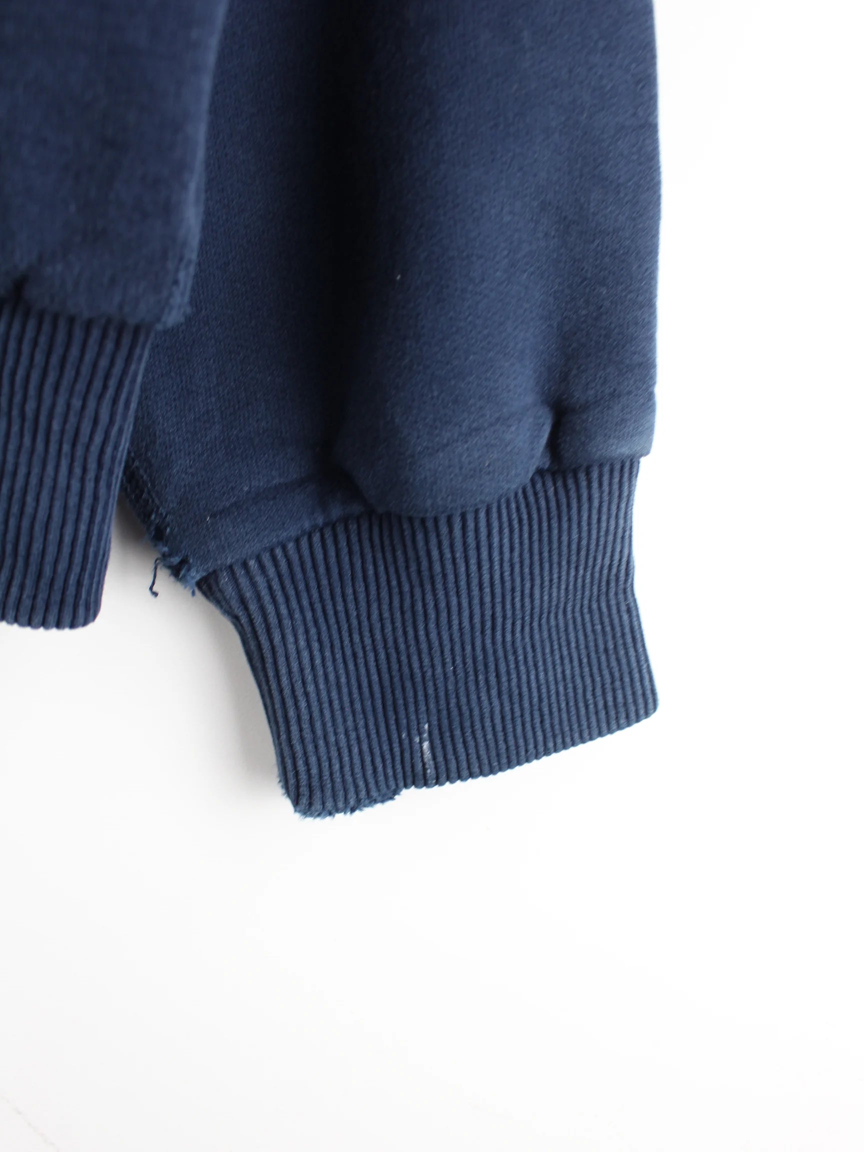 Vintage Sweater mit half Zip in Größe L. Er ist aus einer Baumwollmischung produziert und in Blau bei uns zu bekommen.