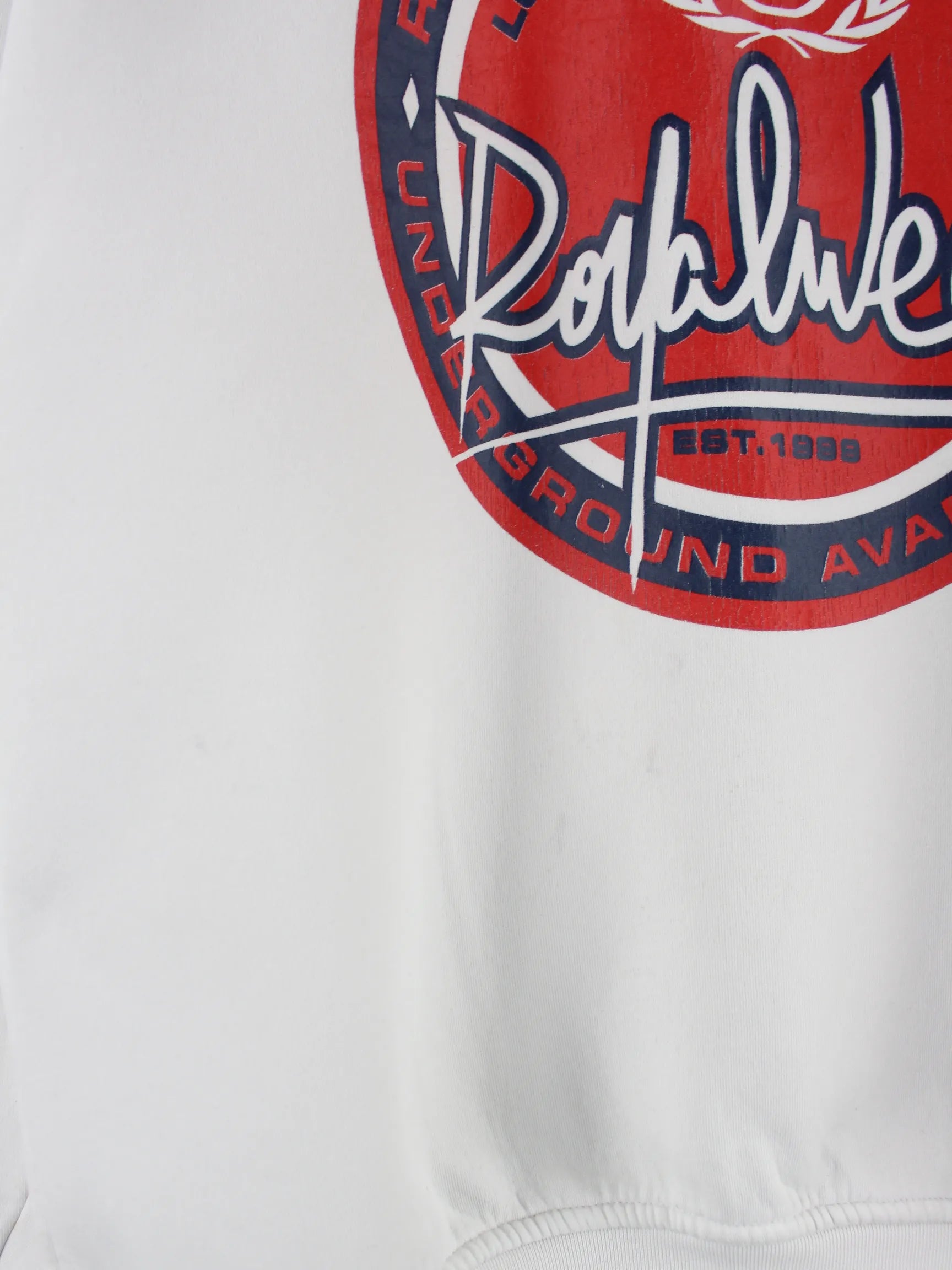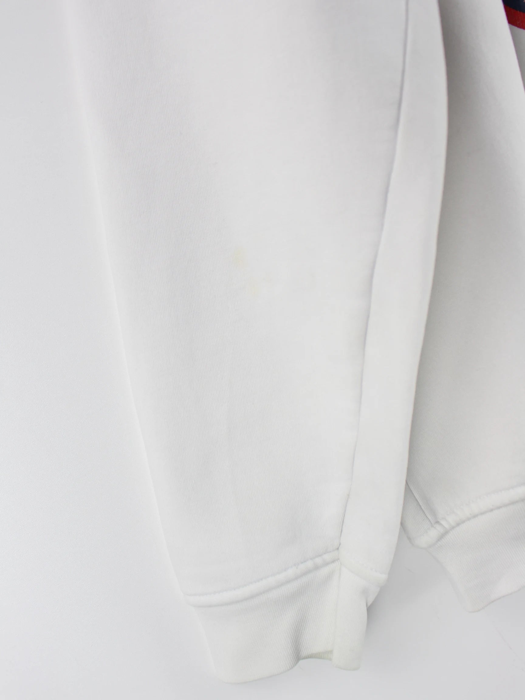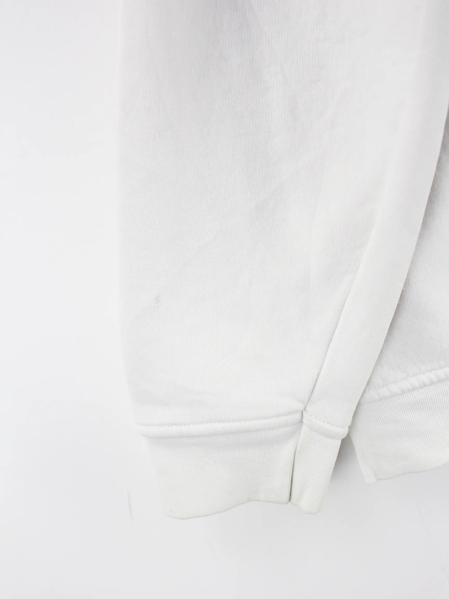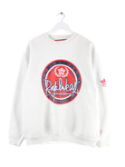 Weißer Vintage Sweater aus Anfang der 2000'er in Größe L. Er ist aus einer Baumwollmischung produziert und in gutem Zustand auf Lager. Mit seltenem Wear Print.